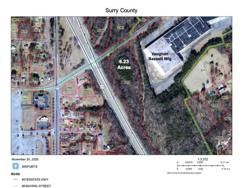 Prime North Elkin vacant parcel, 6.23 acres at the intersection of U S 21 Bypass and Poplar Springs Road. 1100 Ft frontage on U S 21 Bypass (11,000 cars per day) and approx. 390 Ft frontage on Poplar Springs Road (4600 cars per day). Access from Poplar Springs Road, adjacent to Vaughan Bassett Manufacturing. Currently zoned M1 Industrial with potential for rezoning to Highway Business. City water and sewer to site. Priced to sell at $299,000.