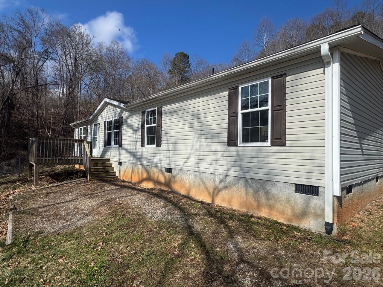 4 Bedroom, 2 Bathroom spacious doublewide with .60 acre fenced lot and winter views! Home needs some TLC (sheetrock repairs needed, flooring, trim, windowsills and doors needed in multiple rooms. Roof was repaired after Hurricane Helene. Lovely kitchen with island and open floor plan. Dog door to safely exit to fenced yard. Wonderful shed for storage. Both front and back porches to enjoy lovely the outdoors! AC unit isn't currently working. Septic was pumped in 2020. Septic permit records not found. Water doesn't drain properly off mountain and has created potholes in driveway. Homes sold AS IS. Privately maintained road.PRICED BELOW TAX VALUE!